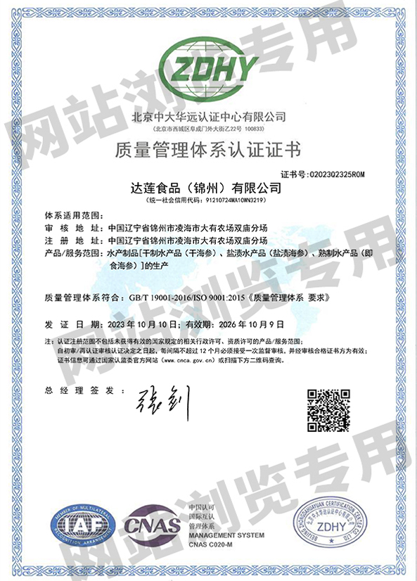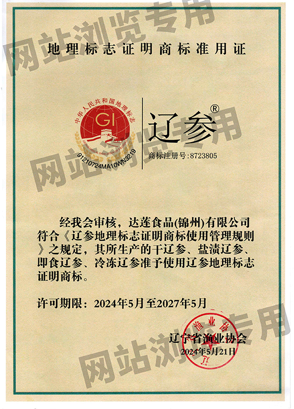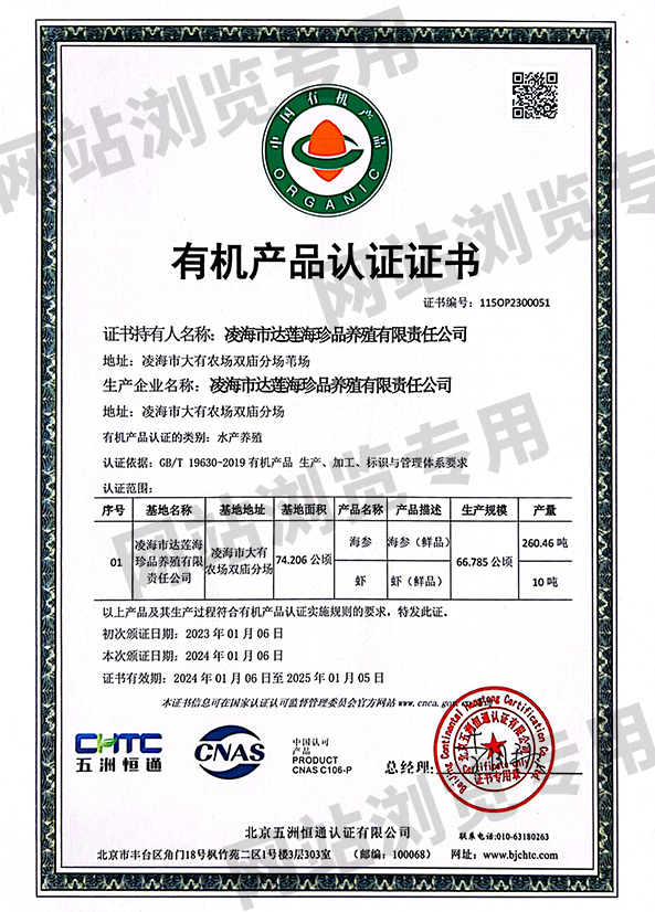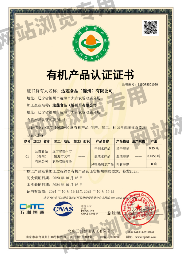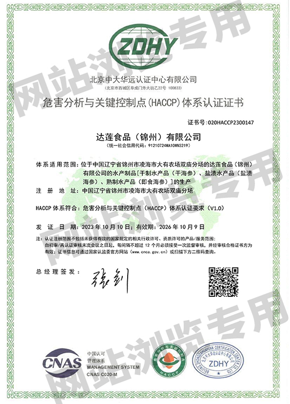 達蓮公司的遼參產(chǎn)品通過養(yǎng)殖、加工雙有機產(chǎn)品認證、遼參認證、ISO9001質(zhì)量管理體系要求認證ISO22000食品安全管理體系、食品鏈中各類組織的要求認證、HACCP危險分析與關(guān)鍵控制點認證等。
